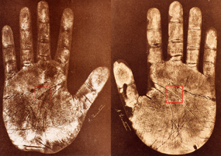 13线的出现提示家族肿瘤史,这张手图的双手都有13线,表示手的主人应该有家族肿瘤史,符合爱因斯坦的情况,这也是我们确定这是爱因斯坦手图的主要根据之一。