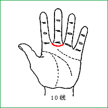 在中指基底部,为一弧形半月圆。10线提示患者性格孤僻。